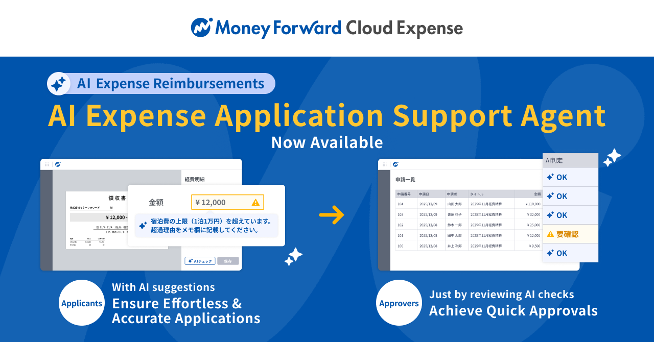 Money Forward, Inc. is launching the AI Agent “Expense Application Support Agent” for select users for its “Money Forward Cloud Expense” platform. This agent streamlines expense reimbursement for both applicants and approvers. It minimizes application errors and rejections, significantly reducing the workload for verifying applications.