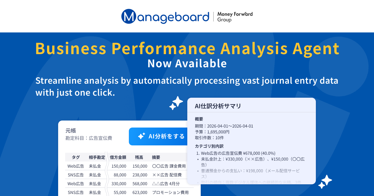 Money Forward Consulting, Inc., a Group company of Money Forward, Inc., has launched the “Business Performance Analysis Agent,” an AI agent for its corporate performance management platform, “Manageboard.” This agent automates the breakdown and aggregation of account titles — previously a manual process — to significantly improve the efficiency of monthly closing operations and support swifter management decisions.