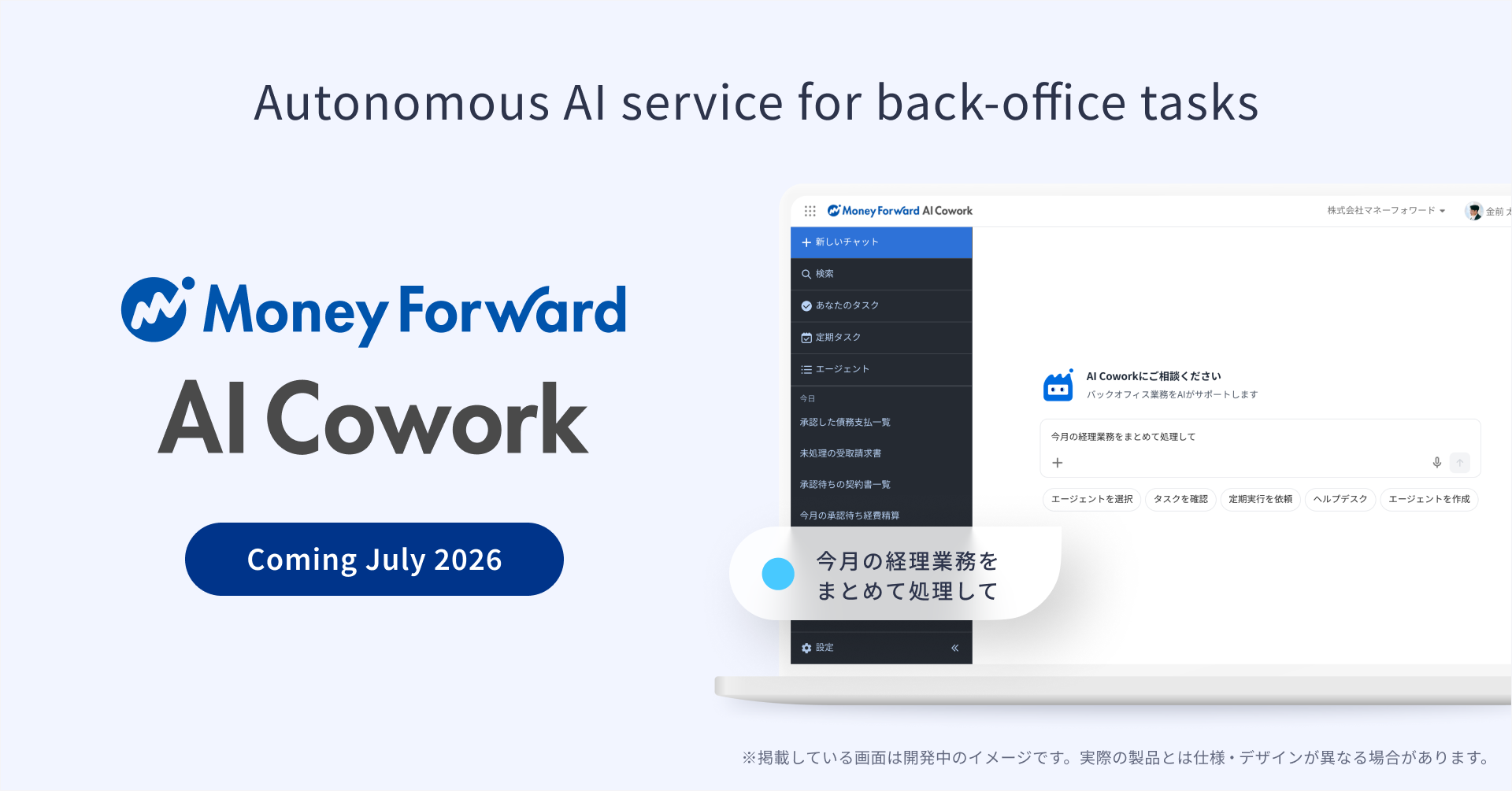 Money Forward, Inc. will launch “Money Forward AI Cowork,” a new service where AI autonomously executes back-office tasks through natural language dialogue, starting in July 2026. Moving beyond conventional task support, the AI acts as a “Coworker” to autonomously handle a wide range of operations, including accounting, HR, and legal affairs.