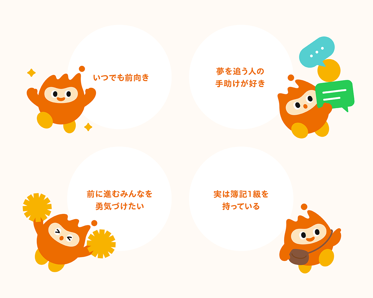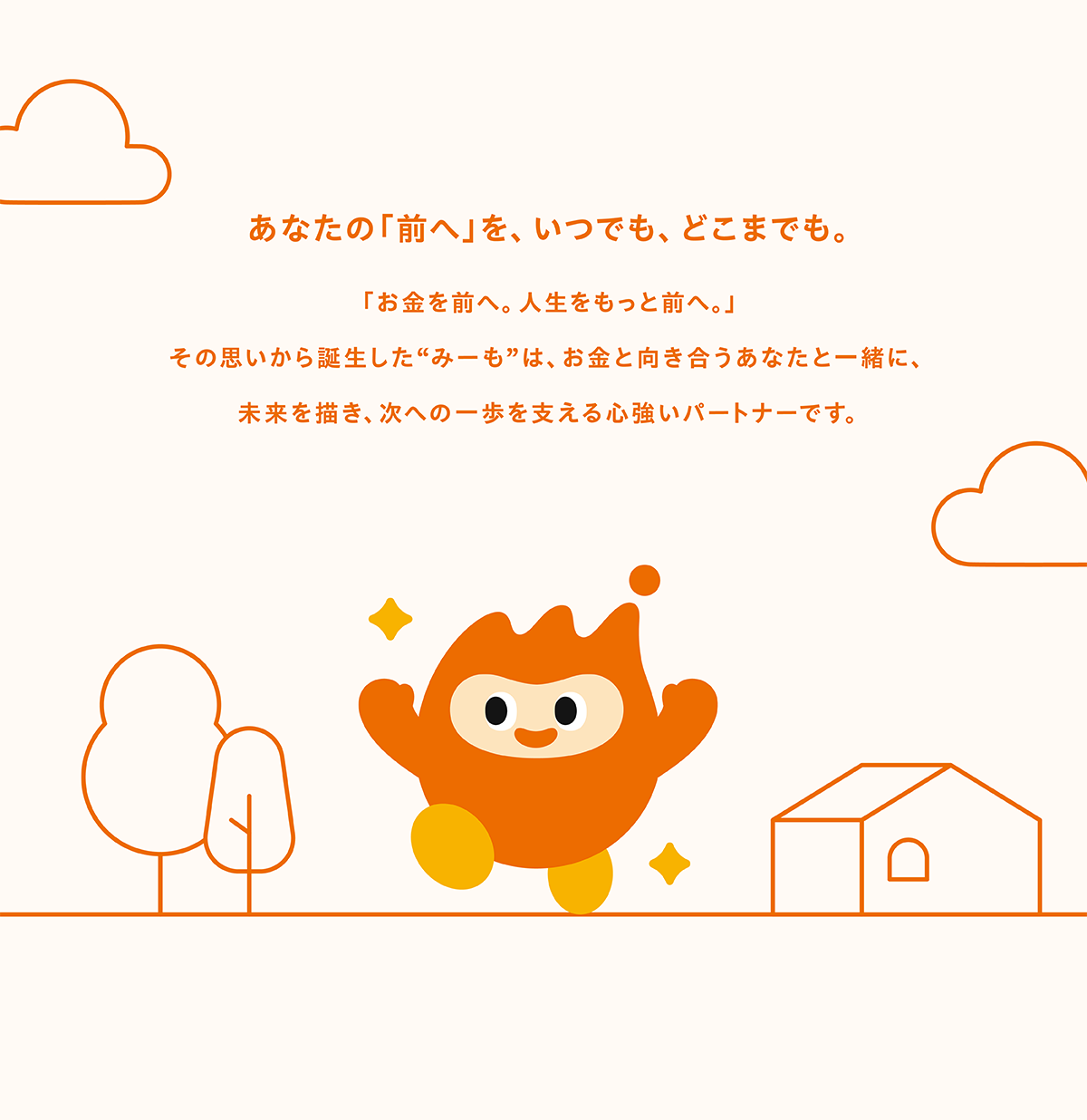 当社は「すべての人の、『お金のプラットフォーム』になる。」というVisionを掲げ、個人や法人すべての人のお金の課題解決を目指しています。様々なサービスを提供するなかで、多くのユーザーにとってこれからも身近な存在でありたいという想いから、公式マスコット「みーも」は誕生しました。キャラクターのデザインは、当社のシンボルマークやコーポレートカラーをモチーフにしています。