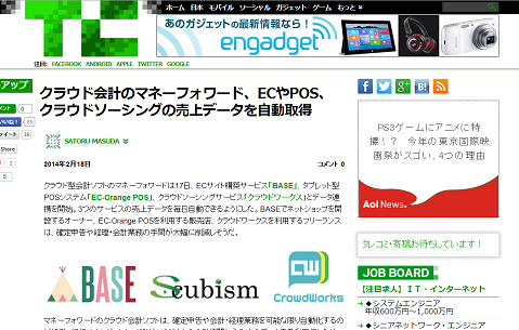 TechCrunchの2014年2月18日(火)付け記事、「クラウド会計のマネーフォワード、ECやPOS、クラウドソーシングの売上データを自動取得」にて、当社のクラウド型会計ソフトについて取り上げていただきました。