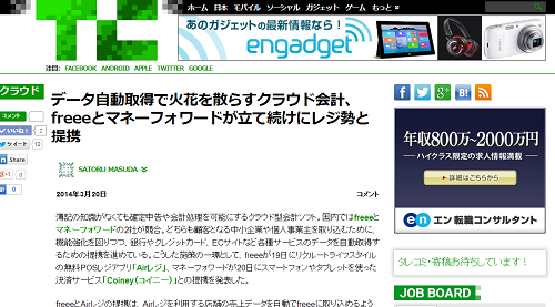 TechCrunch Japanの2014年3月20日(木)付け記事、「データ自動取得で火花を散らすクラウド会計、freeeとマネーフォワードが立て続けにレジ勢と提携」にて、当社のクラウド型会計ソフトについて取り上げていただきました。
