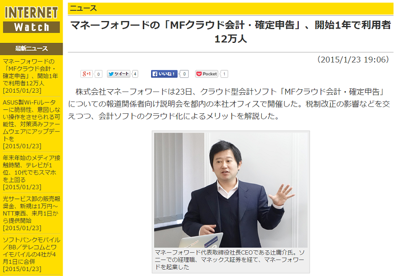 Internet Watch「マネーフォワードの「MFクラウド会計・確定申告」、開始1年で利用者12万人」にて当社クラウド型会計ソフトが紹介されました。