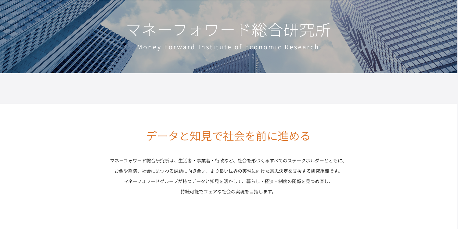 マネーフォワード総合研究所では、生活者・事業者・行政の皆さまがより良い判断を行えるよう、実態に基づく分析と、現場で得られる知見の双方からアプローチしていきます。私たちが日々向き合っている家計・企業データには、社会の変化を捉えるための重要な示唆が数多く含まれています。ユーザーの皆さまからお預かりしているデータを適切に扱いながら、社会の意思決定に役立つ形で価値を引き出していくことが研究所の使命だと考えています。