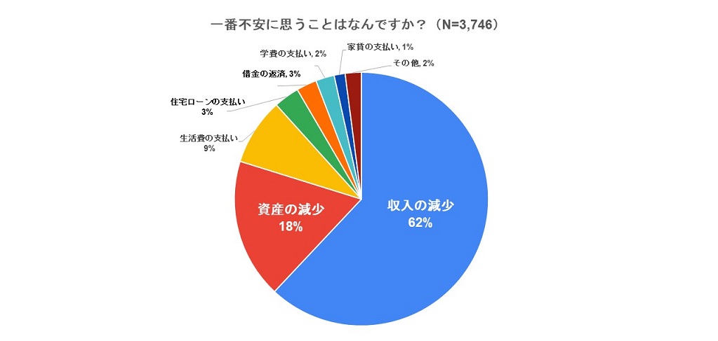 新型コロナウイルスの影響で、48%の人がお金に不安を感じていることがわかりました。不安を感じている人が一番不安に思うこととして、62%が「収入の減少」、18%が「資産の減少」を挙げました。新型コロナウイルスは、収入や資産に対してマイナスな影響を及ぼす可能性があることが考えられます。