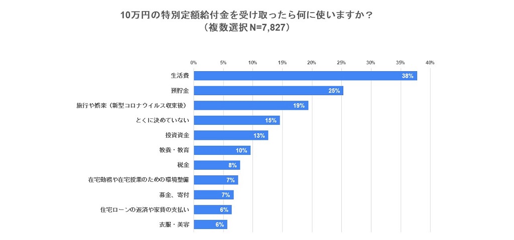 10万円の特別定額給付金の使い道の1位は「生活費」、2位「預貯金」という結果になりました。特別定額給付金事業は、コロナ禍の経済対策を目的として施行されましたが、生活費に充てたり、今後のために貯めておきたいというニーズが高いことが分かりました。
