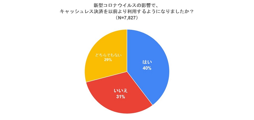 全体の40%が、新型コロナウイルスの影響でキャッシュレス決済を以前より利用するようになったと回答しました。