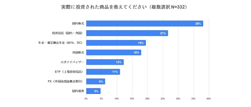 2.投資した商品の1位は「国内株式」、2位「投資信託(外国・国内)」