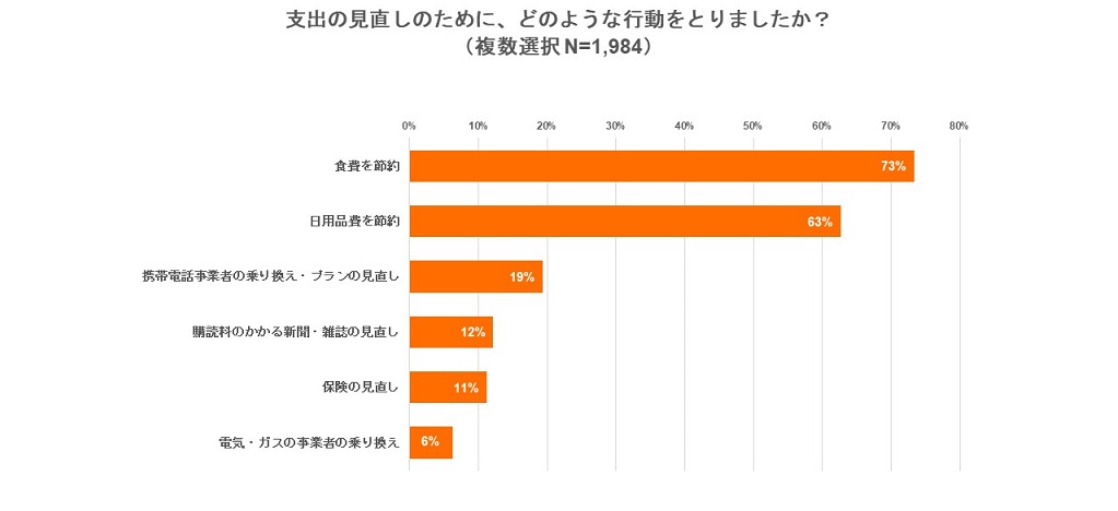 お金に不安を感じる人の約半数が、支出の見直しを行ったと回答しました。支出削減のために、固定費である、「携帯電話事業者の乗り換え・プランの見直し」を行った人が19%、「保険の見直し」を行った人が11%、一方、変動費(日頃の支出)である「食費を節約」した人が73%、「日用品費を節約」した人が63%という結果になり、固定費の見直しをする人が少なく、生活に必要な支出を節約する傾向にあることが分かりました。