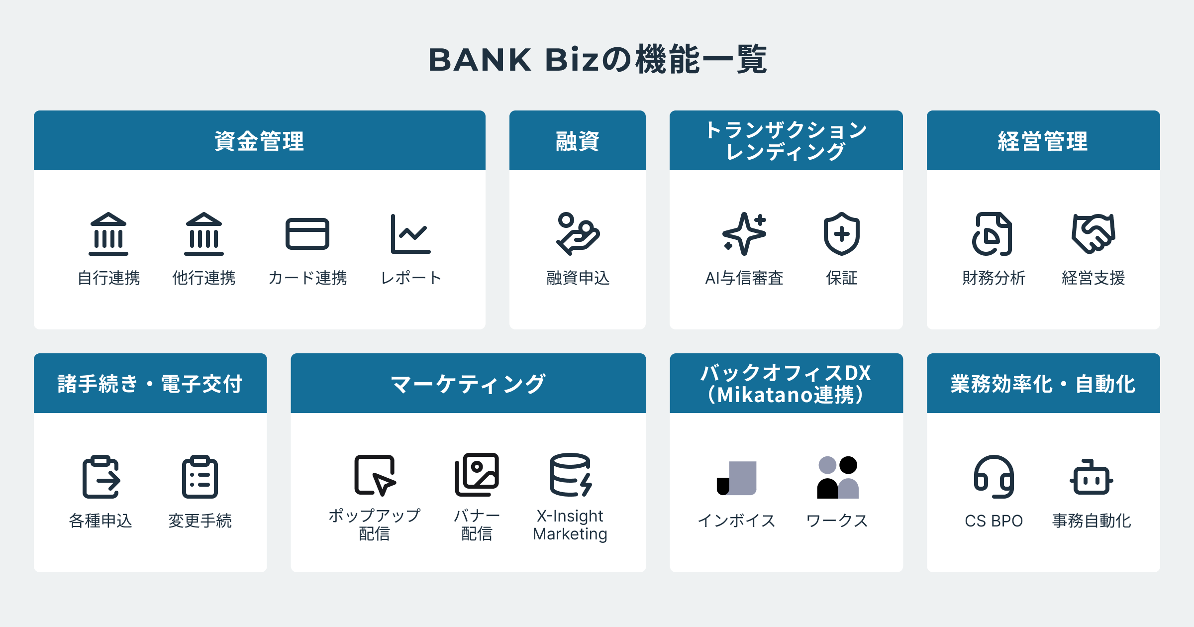 『BANK Biz』シリーズを通じて、金融機関が活用できる主な機能※6と特徴は以下の通りです。