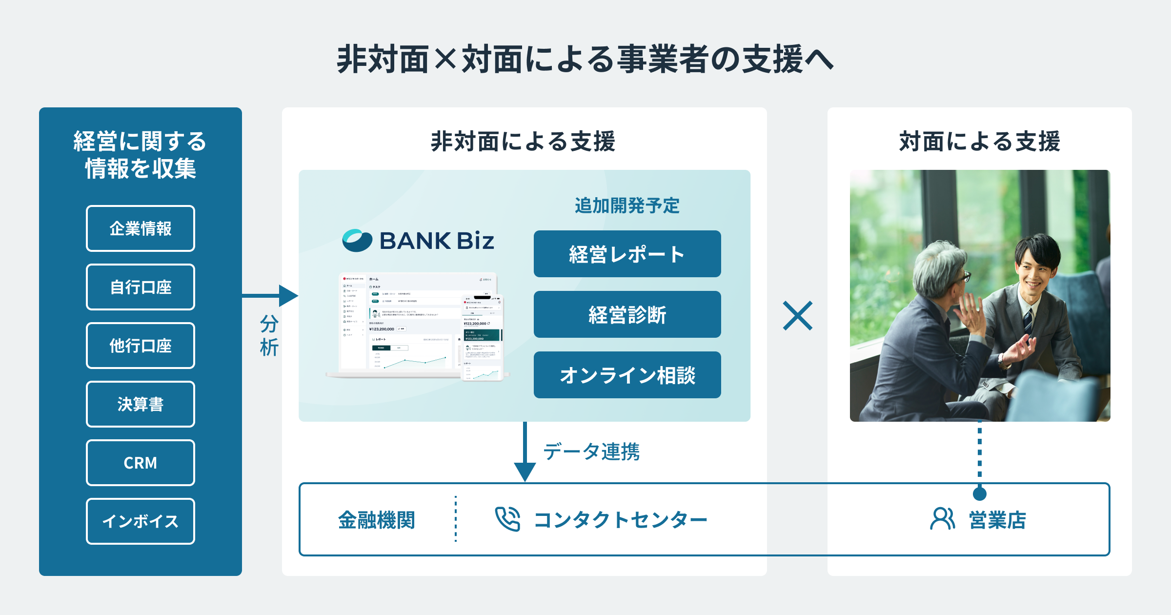 『BANK Biz』シリーズは、金融機関のデジタル×対面での法人ビジネスにおける持続的な収益向上に向けて、継続的な機能拡張を行います。具体的には、データ分析の拡張・カスタマイズによる1to1マーケティングの強化や、事業者向けの新たな経営支援機能・ファイナンスソリューションの提供を検討してまいります。さらに、あらゆる法人向けデジタルサービスをシングルサインオン(SSO)で連携させ、デジタルチャネルにおける事業者の体験価値の向上を目指します。
