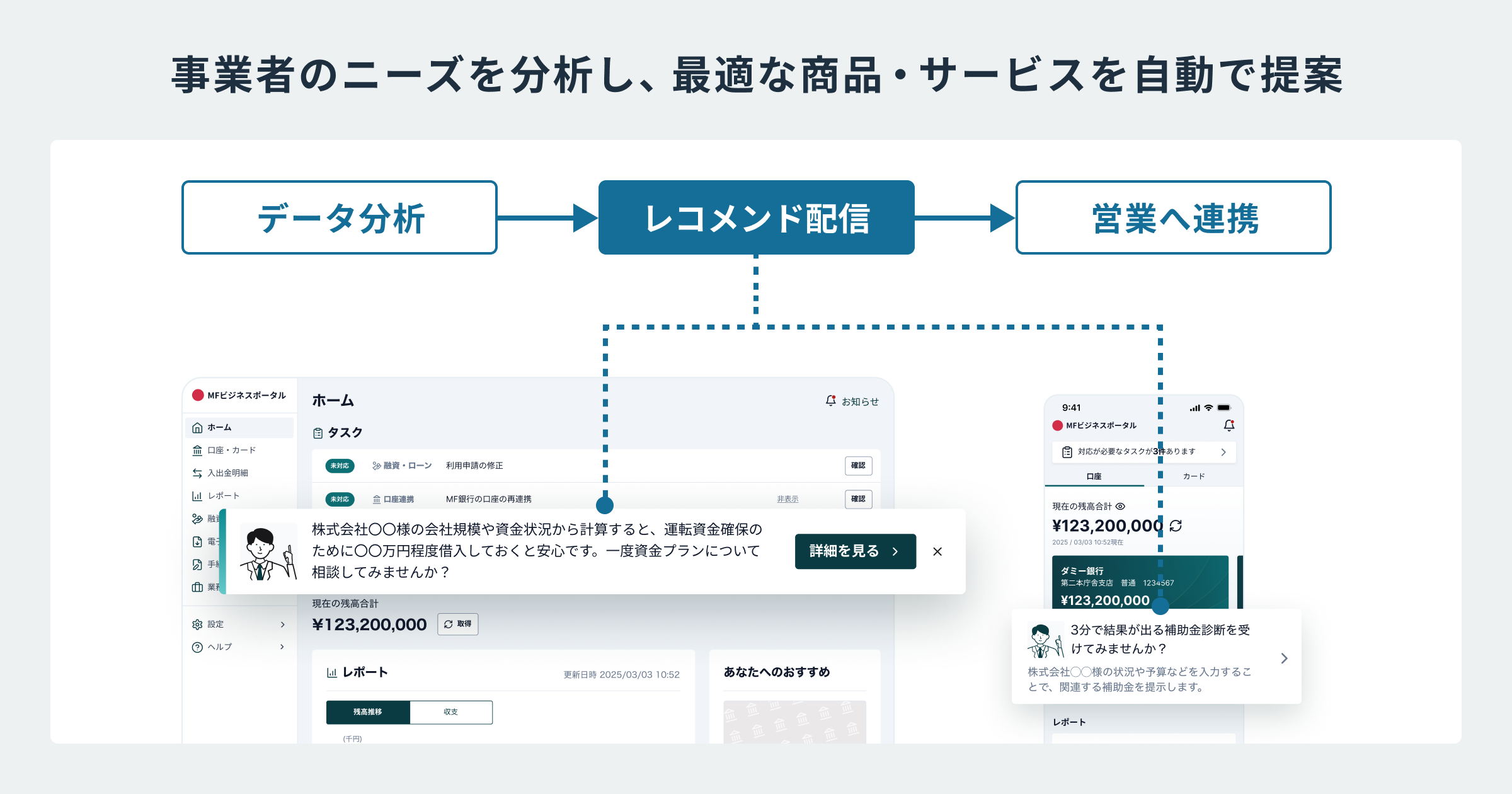 事業者のデータを分析してターゲットリストを作成し、最適な商品・サービス(融資、不動産、ITソリューション、補助金活用など)のレコメンド配信ができます。その後、オンライン相談や対面コンサルティングに連携することで、対面・非対面双方におけるマーケティング高度化を実現します。