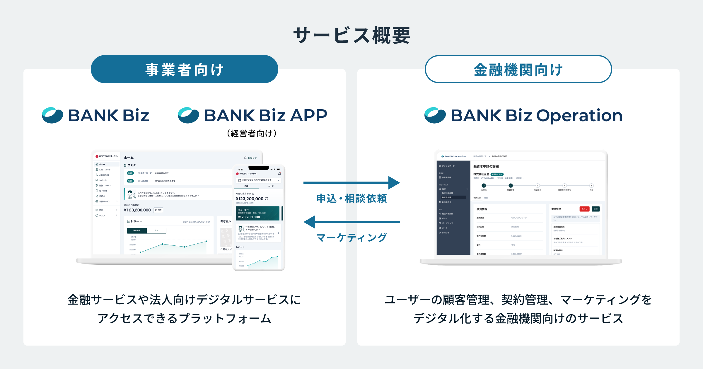 『BANK Biz』ユーザーの顧客管理、契約管理、マーケティングをデジタル化する金融機関向けのサービスです。