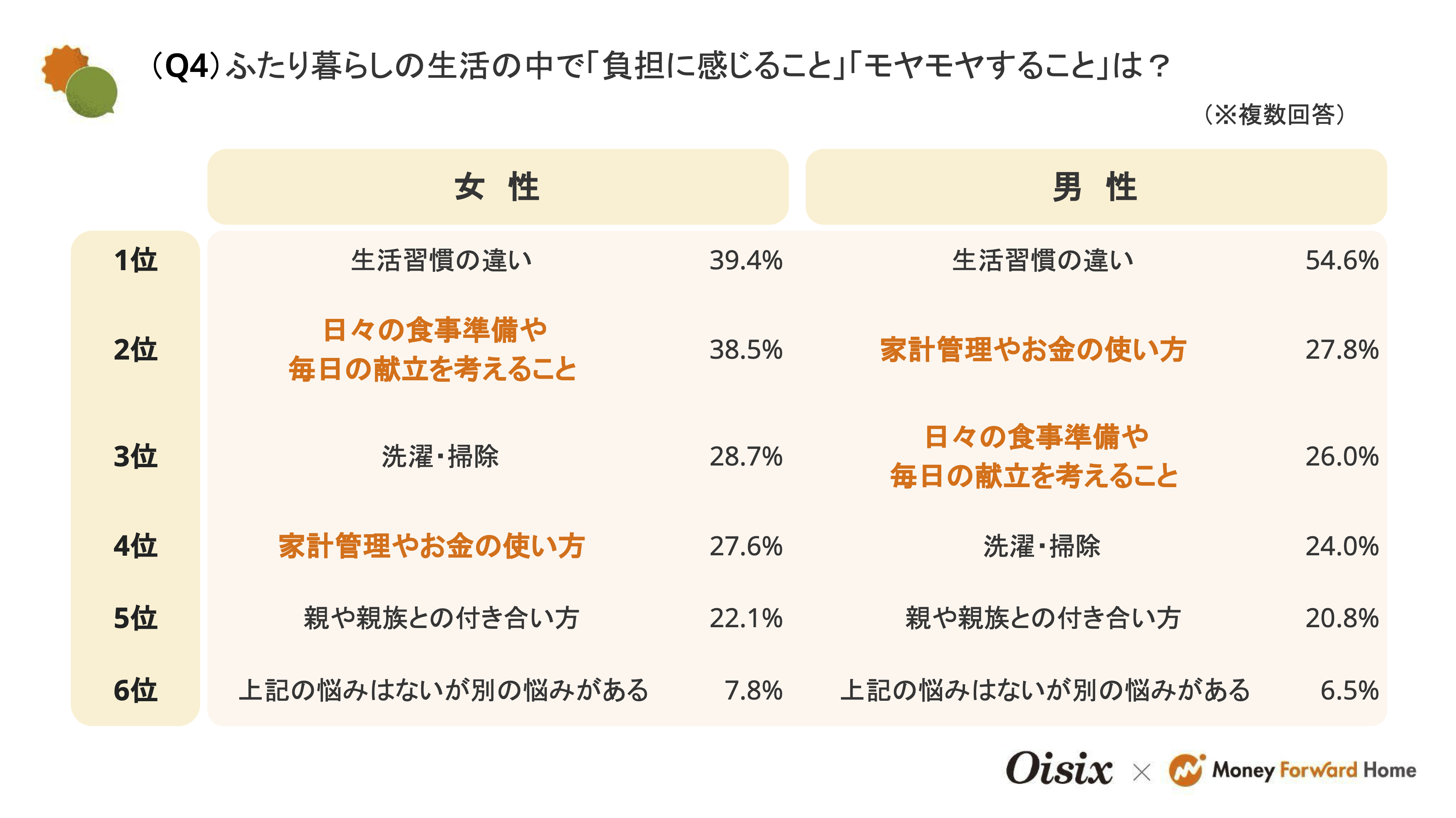 「ふたり暮らしの生活の中で『モヤモヤすること』」については、「生活習慣の違い」が男女ともに最も多く、次いで「食」や「お金」に関する項目が上位に上がりました(Q4)。