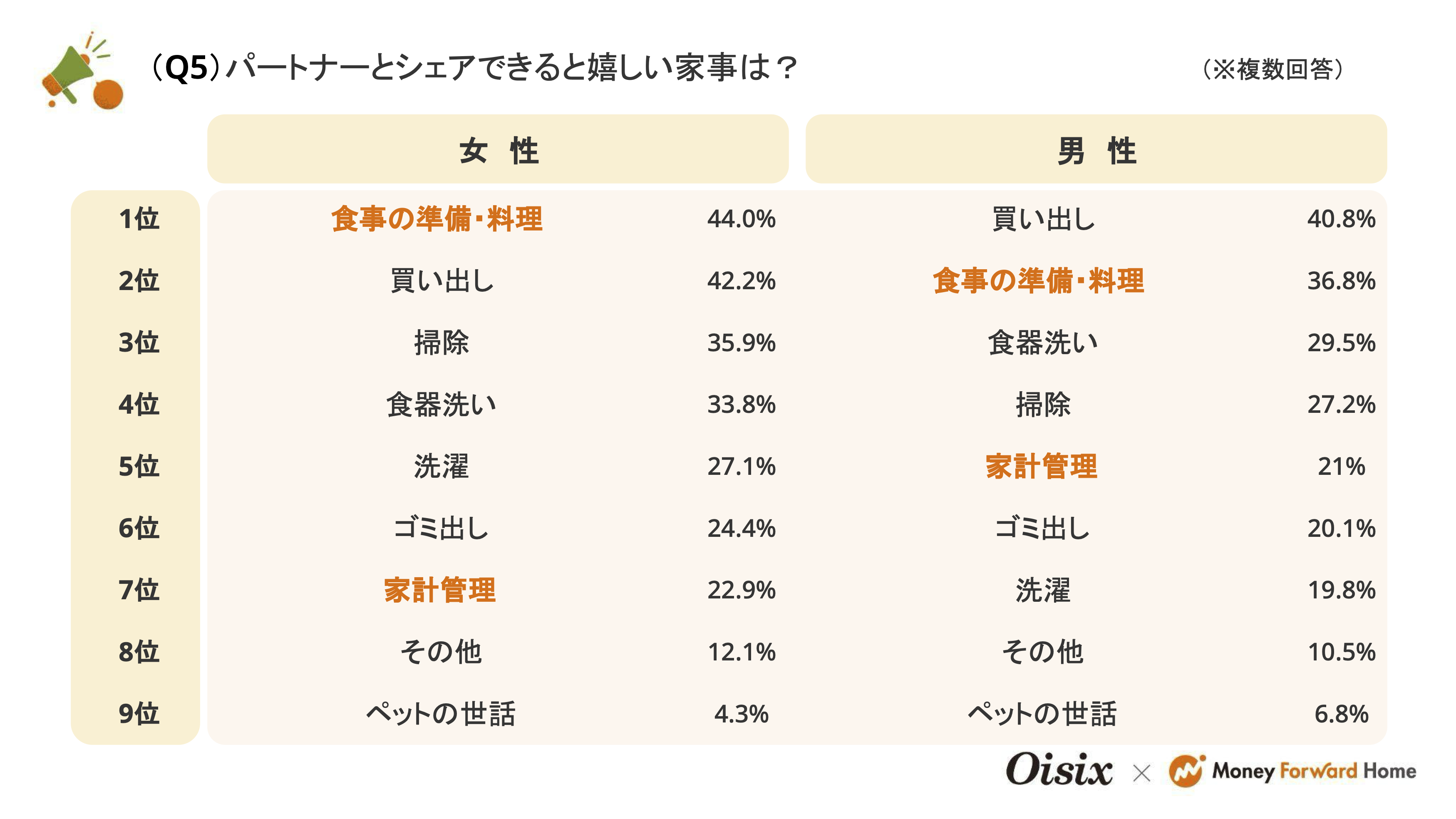一方、「パートナーとシェアできると嬉しい家事」を見ると、「食事の準備・料理」が約4割、「家計管理」が約2割を占めており(Q5)、「食」と「お金」はモヤモヤを生みやすいテーマであるからこそ、パートナーと一緒に向き合いたいと考えている人が多いことが読み取れます。