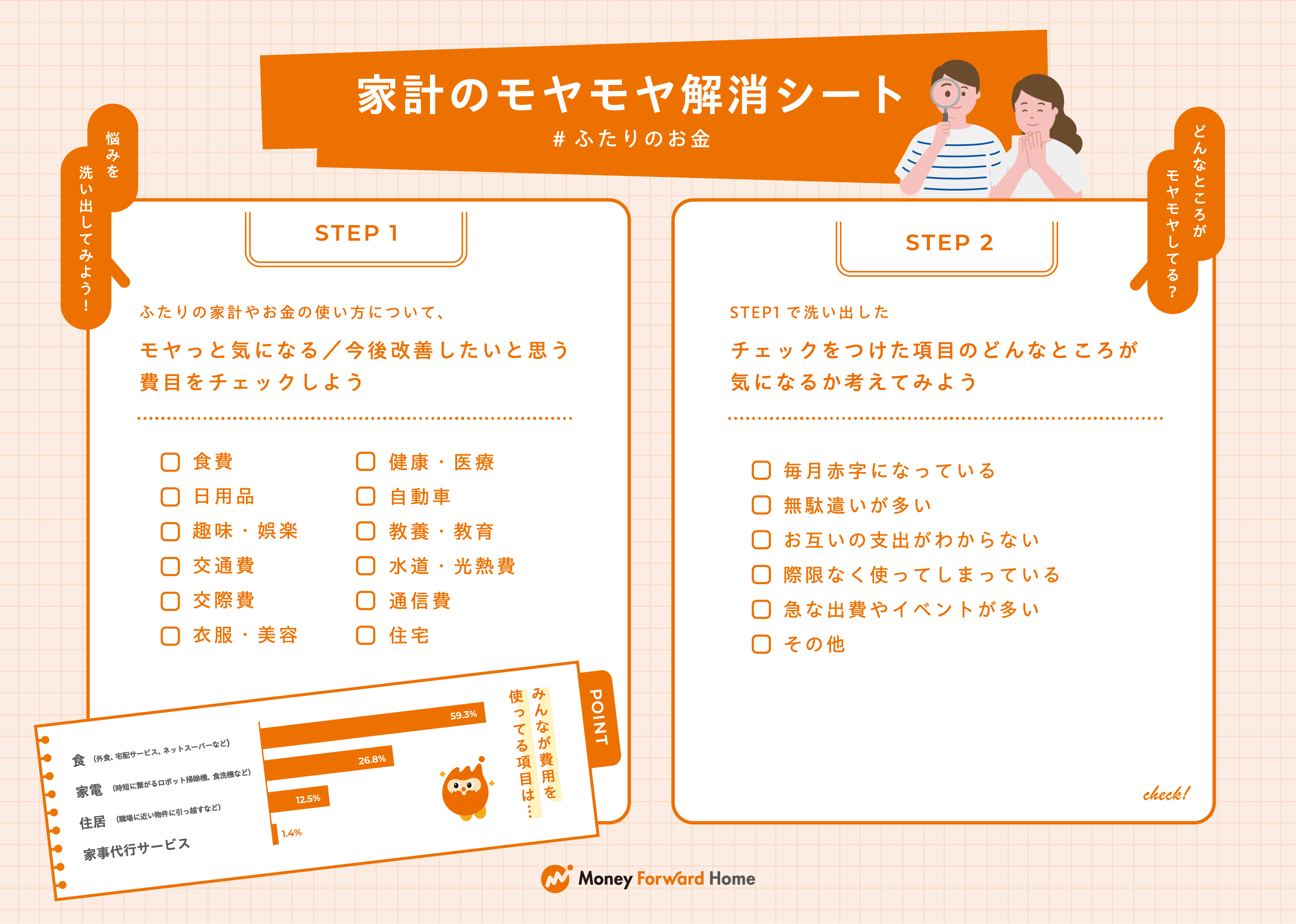 11月22日「いい夫婦の日」に向けて、『マネーフォワード ME』では、ふたりのお金の会話をサポートするワークシート「家計のモヤモヤ解消シート」を公開しました。ワークシートは以下のURLよりダウンロードできます。