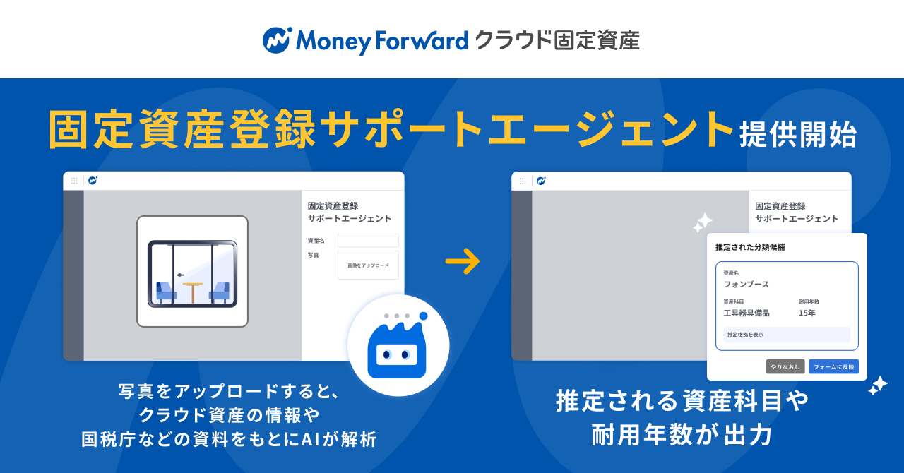 株式会社マネーフォワードは、『マネーフォワード クラウド固定資産』において「固定資産登録サポートエージェント」を一部ユーザー向けに提供開始します。本エージェントは、アップロードした現物写真や入力した資産名をもとに、AIが資産科目や資産種類、耐用年数の候補を推定・提案することで、固定資産登録における情報検索の手間などを大幅に削減し、業務の属人化を防ぎます。