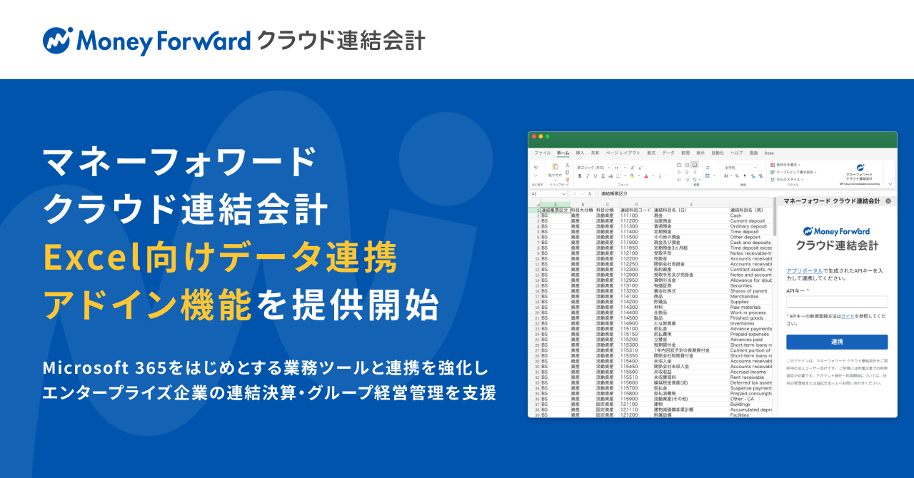 株式会社マネーフォワードは、『マネーフォワード クラウド連結会計』において、連結決算データの取得や更新をExcel上で行える「Excel向けデータ連携アドイン機能」(以下「Excel Add-in」)の提供を開始しました。本機能により、使い慣れたExcelを起点とした分析や資料作成がシームレスになり、エンタープライズ企業の意思決定の高度化を支援します。