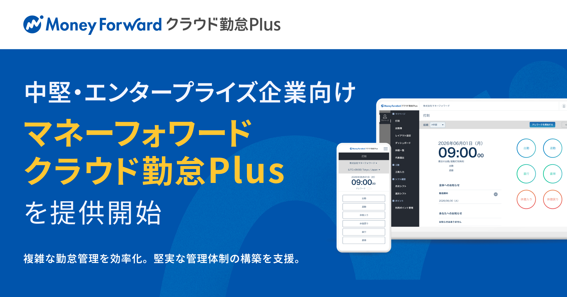 株式会社マネーフォワードは、2026年2月公表のAKASHI事業のグループジョインに伴い、本日より『AKASHI』から『マネーフォワード クラウド勤怠Plus』にリブランディングし、提供を開始します。これにより、多様な働き方や複雑な就業規則を持つ中堅・エンタープライズ企業のバックオフィス業務の効率化を強力に支援します。