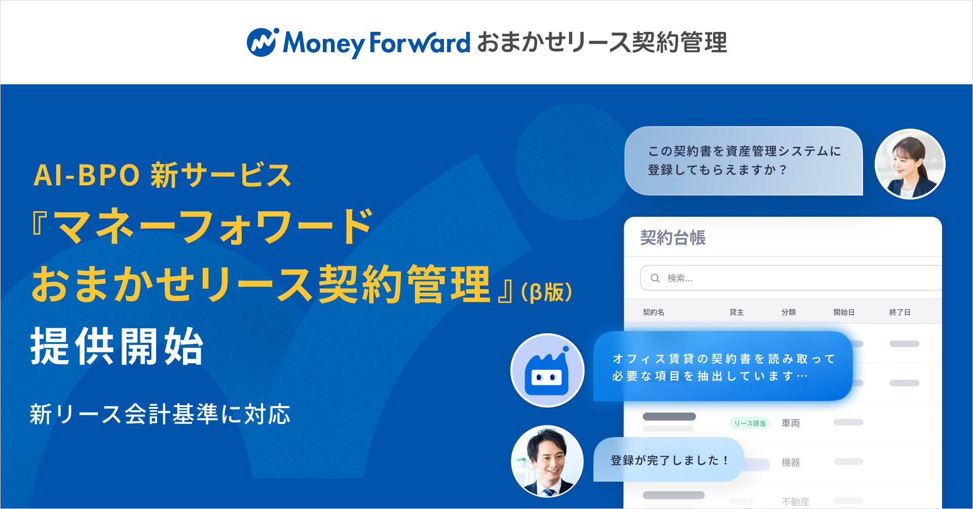 株式会社マネーフォワードは、新たにAI-BPOサービス『マネーフォワード おまかせリース契約管理』(β版)の提供を開始しました。リース契約管理業務における業務設計から実務運用部分までAIと専門オペレーターが包括的に代行し、リース契約管理業務の負担削減とバックオフィスの人手不足解消に貢献します。